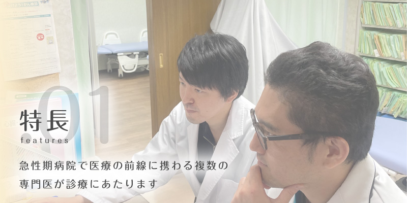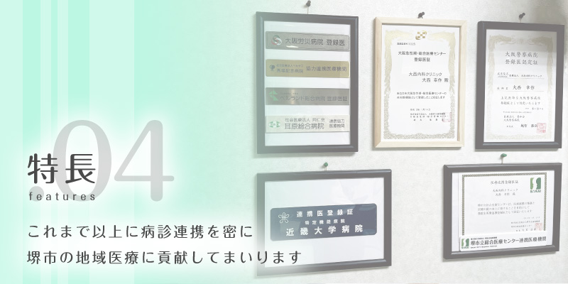 高血圧や糖尿病、高脂血症などの生活習慣病を含めた一般内科はどの担当医でも診療可能です。またより専門的な疾患についても、大阪労災病院などの高次機能施設と連携をとりながら、各担当医の専門性も活かして診療を行います。